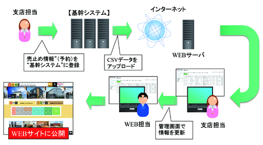 これにより基幹システムとWEBサイトのデータ連携を図るとともに、入稿・物件管理システムを中心とした物件情報の一元管理を実現。各担当者が管理画面で情報を更新、WEB担当者が入稿データを承認するだけでWEBサイトに反映されるため、お客様への即時性の高い情報発信と支店間の情報共有を同時に行うことができるようになりました。