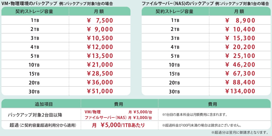 バックアップストレージ容量は1TB~(月額¥7,500~)ご利用可能です。