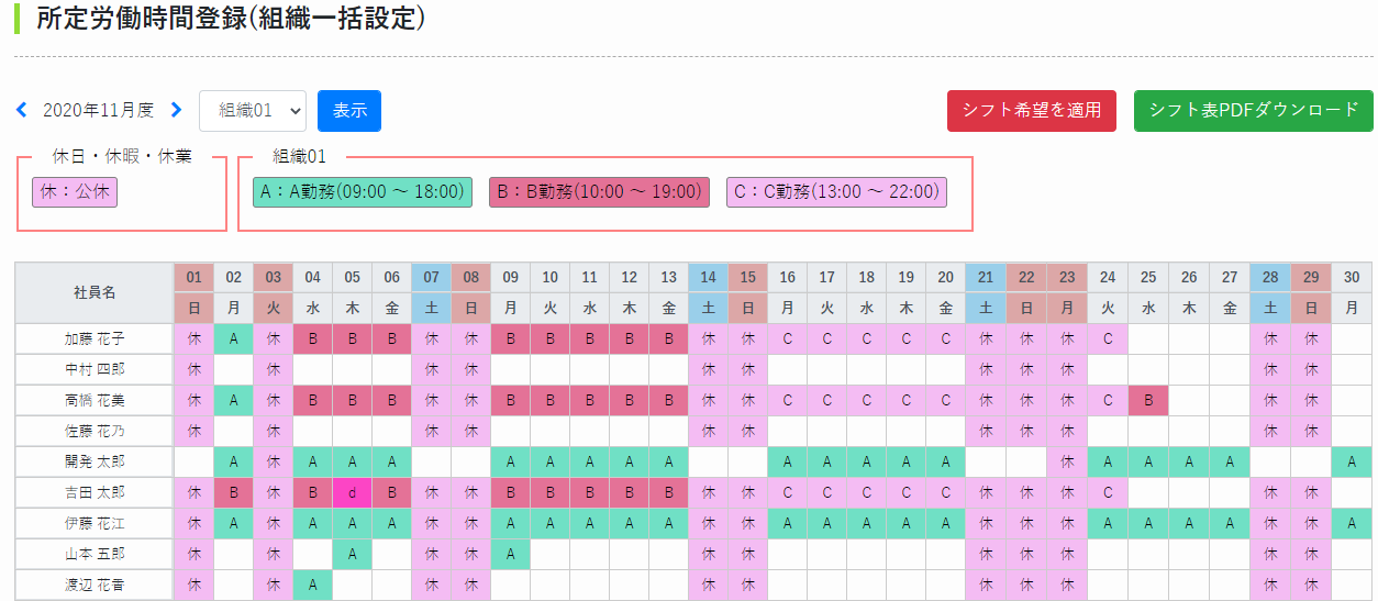 シフトの勤務パターンを登録し、シフト表を作成することが可能です。