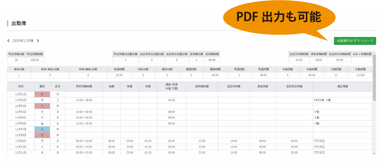 従業員毎の出勤状況を確認できます。PDF出力も可能です。