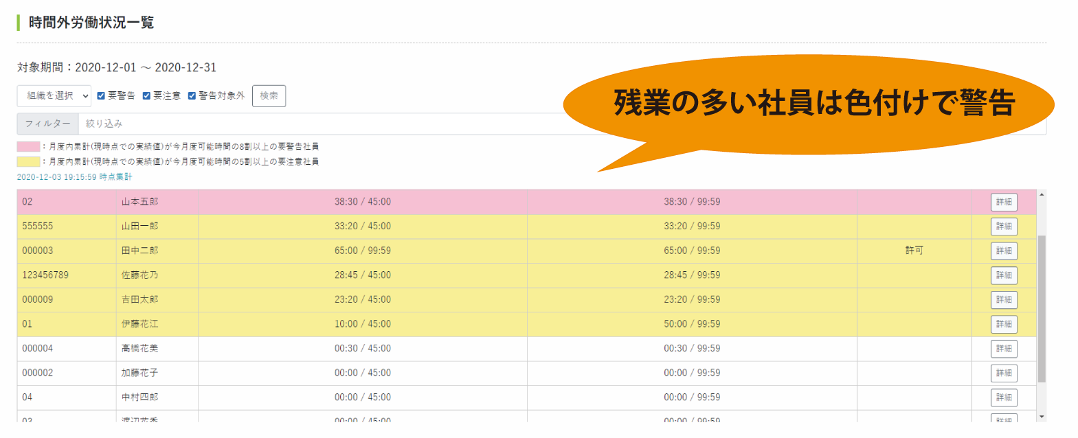 従業員毎の残業時間、残業可能時間数を一覧で確認できます。